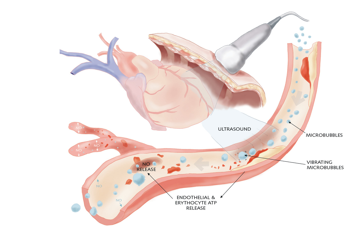 Microbubbles combined with ultrasound vibrate inside blocked arteries, releasing nitric oxide (NO) and adenosine triphosphate (ATP). This helps restore blood flow more quickly, saving heart muscle during a heart attack.